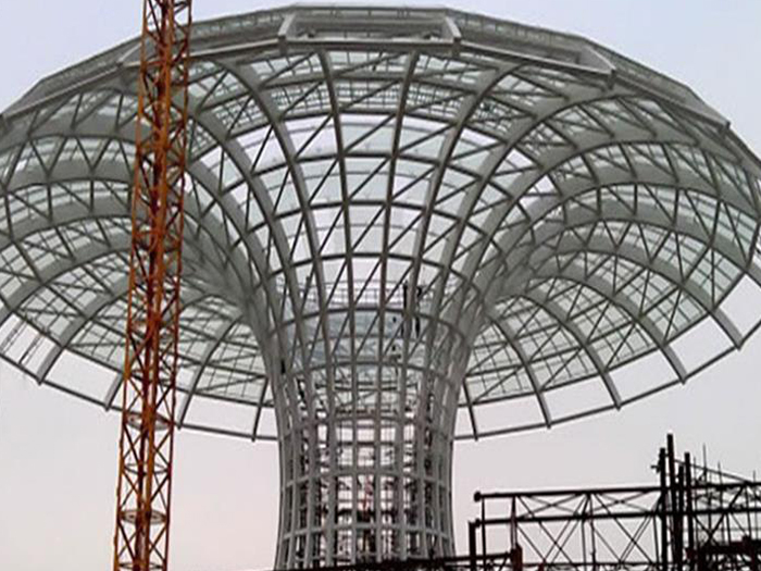 二、球形网架结构因其结构新颖,受力合理,自重轻、用钢量低等优点。如大型体育场馆球形营口螺栓球网架、公共场馆球形网架、电厂营口螺栓球网架、水泥工业球形网架、仓储物流球形网架、营口干煤棚工业球形网架、营口收费站营口加油站球形网架、展览中心、影剧院、商场、航站楼、候车厅、工厂营口车间、仓库、电视塔等球形螺栓球节点网架。国内球形网架结构主要分为:营口焊接球节点网架及螺栓球节点网架两种。螺栓球节点网架其构件工厂内加工量较大,现场安装便捷,适用于现场工期紧,营口施工条件、用电量受制约,网架形状复杂、营口杆件定位困难的异形结构。螺栓球节点球形网架系统基本由营口杆件、螺栓球、支撑支座等组成。按照节点形式可分为交叉营口桁架体系、四角锥体系、三角锥体系等。支撑方式多为固定支座支撑。对于大面积、大跨度及有特殊受力或伸缩要求的网架结构可采用橡胶支座、滑移支座、球铰支座等支撑形式,以满足结构自身的受力稳定、均衡,便于内力释放等设计要求。